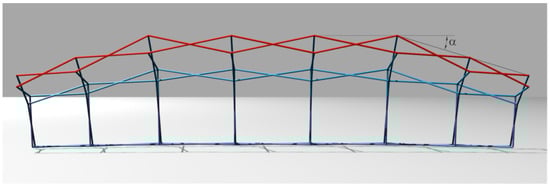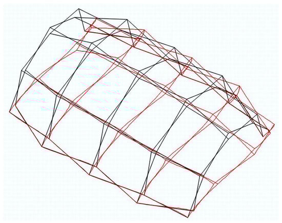 The effect of reciprocal support implies a degree of embedding of the bar in the plane of the scissors that can reach up to 98%. It represents a very notable improvement in the performance of the deployed structure against gravitational loads and wind suction loads, as will be seen in Section 6. However, the matrix methods of articulated joints are not suitable for lateral loads on the tympana. A structure of square modules is a quasi-mechanism for these loads, so it needs bracing elements that can be cables, bars or the textile cover itself. If these bracings do not exist, the calculated lateral displacements are very strong, even taking into account in this case the favourable effect of the conical ends.