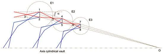 It is simple to design conical vaults that meet the conditions of foldability following the method of Ponce and Sánchez [12] and that conform to a cylindrical vault at its ends (Figure 5). The SLEs in the longitudinal direction are shown in red and the SLEs in the transverse direction are shown in blue. A vertex of the cone O is defined with the desired angle α (Figure 6). To adjust the lengths of the first SLE, draw an ellipse E1 with foci at points 1 and 2 and which passes through point 3’. This ellipse cuts the midline of the conic dome at point 3 and by prolonging the SLE sections, points 4 and 5 are defined. The ellipse E2 with foci at 4 and 5 and which passes through 3 allows the definition of point 6 and thus the next SLE. By continuing the process, any number of sections can be defined. The transverse arcs are proportional to the vertical distances 4–5 and 7–8, which makes it possible to calculate their lengths. This layout also makes it easy to define the angles formed by the SLEs with the joints, which is essential for the design of the reciprocal linkages.