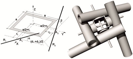 To calculate the base value of joint a, the position of the axes of the two bars of diameters d1 and d2 is taken as shown in Figure 6. The straight lines R1 and R2, which correspond to the axes of the bars, pass through the points A1 and A2 and form angles α and β with the reference plane. Their unit vectors are