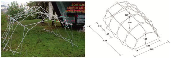 The model has its supports in the horizontal plane, which allows it to be fixed to the ground. For the tests, the lower joints were screwed to omega profiles, which in the case of the real structure allow the panels that form the floor of the building to be placed between them. For the intended use as an emergency enclosure, it is considered that the cover will be textile and in such a way that it can be folded with the assembly. The folding conditions of the textile cover have been widely analysed in previous publications [31]. It is also possible to provide a rigid cover that would be attached to the mesh once deployed.