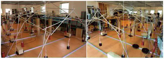 The previous tests carried out by our team on reciprocal linkage structures referred to models loaded in these joints [26,27,28]. However, in several practically useful structures it may be convenient to place the cover on the lower layer with articulated joints without reciprocal support, as occurs in cylindrical vaults.