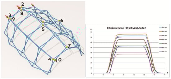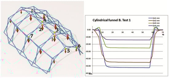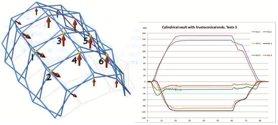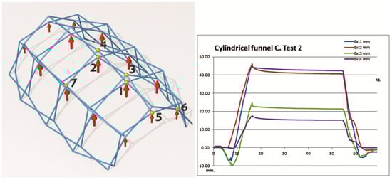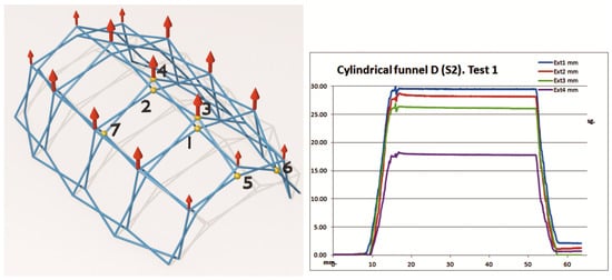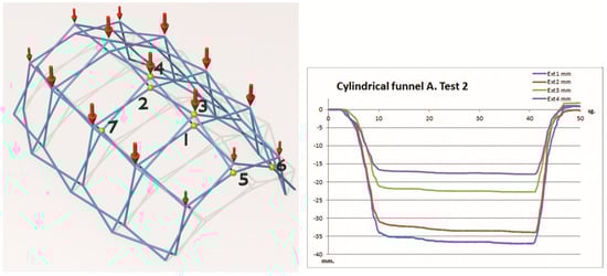 The tests were carried out in the structures laboratory of the ETS Architecture of A Coruña with a test bench of its own manufacture. Loads of 10 kgf (98.1 N) and 5 kgf (49.05 N) have been applied at the joints indicated in each test (Figure 8). The displacements have been measured with inductive displacement sensors Sm407.100.2.T from Schreiber Messtechnik GmbH, Oberhaching, Munich, Germany with linearity < 0.25% and deviation < 0.01%/°C. Data collection has been completed with NTK021 digital extensometers from Neoteck Technology LTD, Hong Kong, China with a precision of ±0.1 mm. The displacements have been measured at the most significant points of the mesh, carrying out loading–unloading cycles.