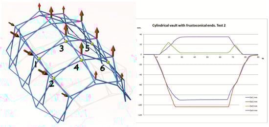 This test was carried out in the same way as the previous one, but the loads were applied to the joints of the lower layer of the mesh (Figure 14). In this case, oscillations occurred in the loading and unloading sections, caused because the loads do not come into load simultaneously due to small errors in the model and since it is loaded at the lower joints, it is very sensitive to this effect. The displacements are greater than in the previous case, but no buckling phenomenon occurs.