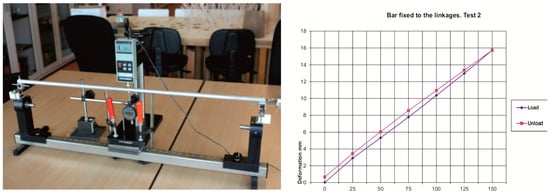 This behaviour, better than expected, may be due to the rigidity of the linkage itself or the possible effect of reciprocal support in the horizontal direction. To determine this issue, a bending test was first carried out, applying a point load to an aluminium bar identical to those used in the model. It was first tested in simple bending and then fixed to two linkages like those used in the model that were rigidly attached to the base, in order to determine the possible stiffening effect.
