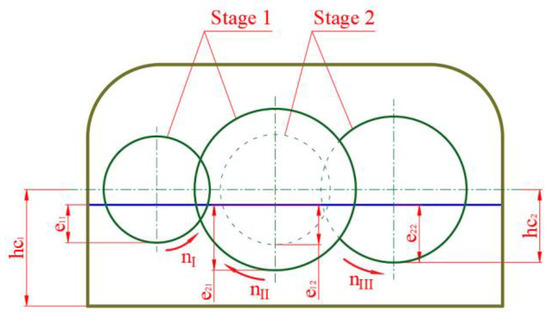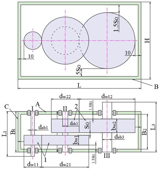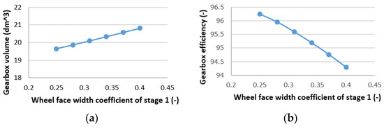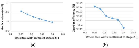 Table 7 reveals that Xba1 selects the lowest value (Xba1 = 0.25), while Xba2 selects the highest value (Xba2 = 0.4). This is due to the fact that a small box’s cross-sectional area (LxH) is required to produce the smallest gearbox volume. In order to accomplish that, dw21 and dw22 must be about equal [32]. Additionally, because the second stage has a higher torque, a larger Xba2 is required in order to decrease the diameter of dw22. Conversely, a smaller Xba1 must be chosen in order to raise dw21 because the first stage has a lower torque.