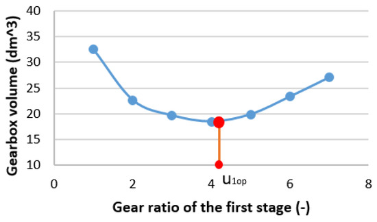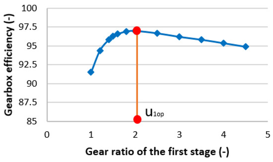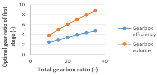 Figure 8 illustrates the relationship between the optimum gear ratio for the first stage (u1) and the overall gearbox ratio (ut). Additionally, Table 4 displays newly calculated constraints for the variable u1.
