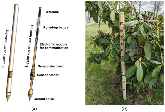 The EU project “PLANtAR” (https://plantar-project.eu/ (accessed on 13 May 2024)) aims to develop such cost-efficient, miniaturized, networked, and partly biodegradable monitoring electronics [16]. Figure 1 shows one of the sensors developed in the project, consisting of a miniaturized electronic module with a single-chip radio system, sensors for measuring temperature, soil tension, and nitrate [17]. The sensors and the electronic module are fabricated from materials that are biodegradable or inert with a minimum amount of metal and ceramic and allow for remaining them on the field when harvesting. The device is powered by a biodegradable zinc–manganese dioxide battery. For wireless communication, a printed antenna on paper is used. A gateway collects the data transmitted by the distributed sensor devices and brings it to the internet to a central server running an expert system.