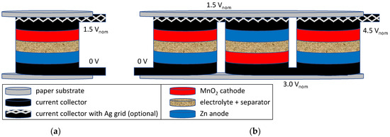 The basic idea of realizing a printed flat zinc–carbon battery is depicted in Figure 2a. There is a layer-wise stacking of the required components: silver grid (optional), current collector, anode, electrolyte + separator, and cathode. A functional description can be found in [18,19]. The advantage of this printing approach is that the series connection of batteries can also be easily adapted by adjusting the layout. In Figure 2b, a series connection of three cells is shown, resulting in a total battery voltage of 4.5 Vnom. For this battery, just one side of two different substrates is used.