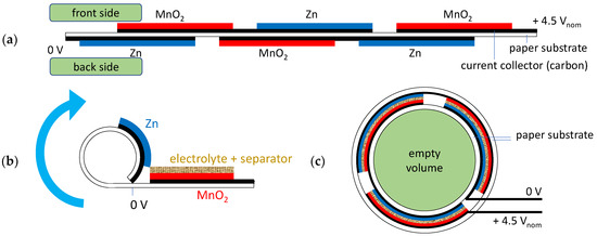 Scheme of a printed zinc–carbon battery setup: (a) stack setup of a 4.5 Vnom battery consistent of three cells; (b) beginning of roll-up, including electrolyte and separator layer; (c) rolled-up 4.5 Vnom battery from Figure 3a, pictorial schematic.