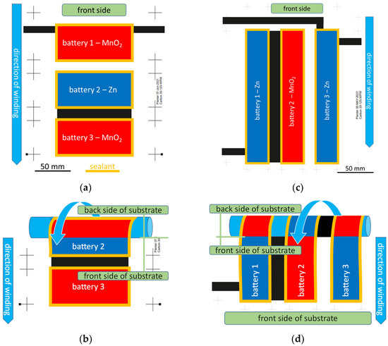 Scheme of two different 4.5 Vnom rolled-up battery layouts: (a,b) crosswise battery cells perpendicular to winding direction. (a) Shows the front side layout, while (b) shows the overlap when rolling up. (c,d) Lengthwise battery cells parallel to winding direction; (c) shows the front side layout, while (d) shows the overlap when rolling up.