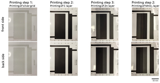 For both layouts (see Figure 4), a set of three or four screens is manufactured for printing the silver (optional), carbon, zinc, and manganese dioxide layers. A screen-printing machine (EKRA E1 XL, IBE SMT Equipment, LLC, Magnolia, TX, USA) is used to print three or four layers: 1. a silver grid (DuPont PV410, DuPont, Wilmington, DE, USA) to lower the internal resistance of the battery (optional); 2. a carbon layer (Henkel Electrodag, Henkel AG & Co. KGaA, Düsseldorf, Germany) to cover the silver and prevent any chemical reaction of it with the battery cell; 3. a zinc layer as the anode of the battery; 4. a manganese dioxide layer as the cathode of the battery. After each printing step, the ink is fully dried in a convection oven (3D Micromac microDRY, 3D-Micromac AG, Chemnitz, Germany, 110 °C, 10 min) before applying the subsequent layer.