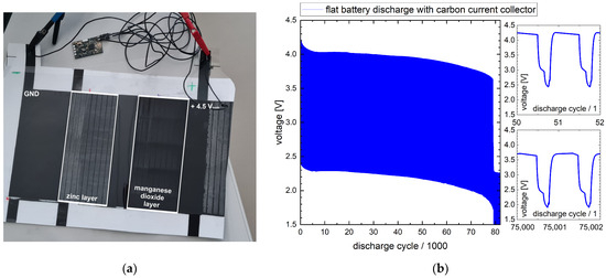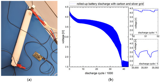 In this case, the battery performance was determined with a rolled-up battery, as shown in Figure 8a. The measurement results are given in Figure 8b. Due to less electrolyte inside the battery compared with the flat assembly of Section 3.2, the overall discharge cycles decrease from 44,000 to 34,000. This still matches the requirement of 20,000 cycles minimum.