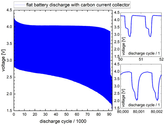 In the discharge diagram recorded by the potentiostat shown in Figure 7, two zones can be differentiated: from 0 to 90,000 cycles, the voltage fluctuated between an upper (4.3–4.0 V) and a lower level (2.9–2.0 V). At the higher voltage level, there is low power consumption of the electronics. During wireless data transmission, the current demand is the highest, resulting in a decreased voltage level due to the internal resistance of the battery. The electronics demand a minimum voltage level of 2.5 V. Therefore, the reliable operation is only in the range of 0 to 44,000 cycles. For the intended operation, the internal battery voltage should become lower. This can be realized by having a lower resistance in the current collector by a silver grid underneath. This modification is described in Section 3.3.