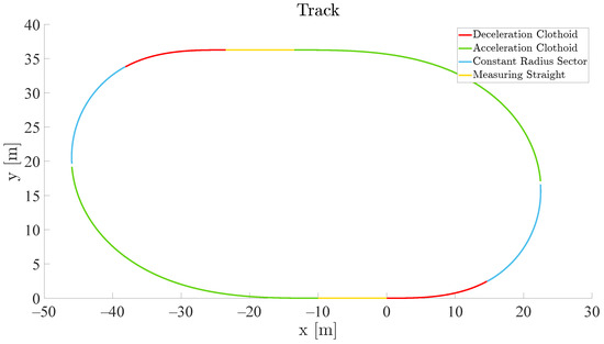 The layout and configuration of the guide structure have undergone a detailed examination aimed at minimizing centrifugal forces while effectively bearing the vertical forces acting on the tire. The testing path is derived from a flat surface measuring approximately 70 × 30 , visually presented in Figure 6. The path is segmented into four distinct sections, repeated twice: a measurement straight, a deceleration curve, a constant radius curve, and an acceleration curve: