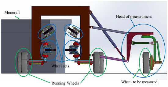 In order to achieve significant data for the detailed design of the whole system, a multibody model was developed in MSC Adams to provide a more accurate estimation of loads. This model originated from the machine layout defined in the CAD model. All elements and parts with assigned density were imported, together with various joints and springs. Tires with properties specified in a TIR file were added to simulate contact with the road for both the running wheels and the wheel to be measured.