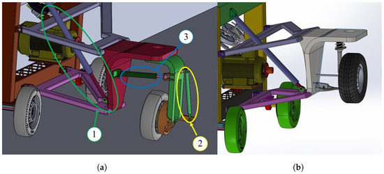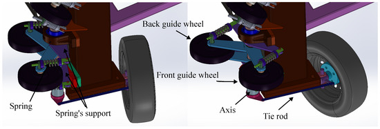 Each wheelset, composed of two wheels, can pivot about an axis, which allows the running wheel to auto-steer during the turn as shown in Figure 8. In particular, the front guide wheel and the back guide wheel of the horizontal wheelset have the same springs, so the axis rotates keeping the spring’s support tangential to the monorail. Then, a tie rod connects the wheelset support to the running wheel so that when the set turns along its pivot axis, the running wheel turns with it.