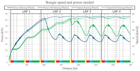 Power needed by the cart and speed of the cart with 4 steering wheels (blue and dotted blue) and fixed wheel (green and dotted green). The color bar at the bottom of the figure represents each part of the circuit as shown in Figure 6.