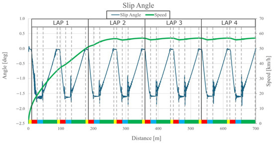 The slip angle of the wheel to be measured as a function of the traveled distance. The color bar at the bottom of the figure represents each part of the circuit as shown in Figure 6.