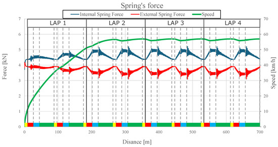 Internal spring force (blue) and external spring force (red) of the front guide wheels of the horizontal sets. The color bar at the bottom of the figure represents each part of the circuit as shown in Figure 6.