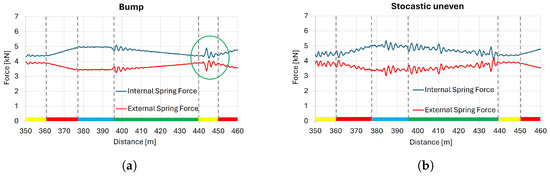 Other simulations are conducted to better estimate the loads during tests on uneven pavements and bumps. The simulation control parameters are the same as in the previous tests, but the pavement is different. Only a portion of the simulation is shown to facilitate a more detailed analysis of the graphs. Figure 13a shows the forces on the inner and outer springs, which are represented in blue and red, respectively. The simulation analyzes the tested wheel encountering a bump on the straight section (green circle). Figure 13b shows the tested wheel running on an uneven stochastic pavement throughout a sector of the lap. In both cases, the cart shows smooth behavior during the tests, without causing overloads, detachements, or excessive vibrations.