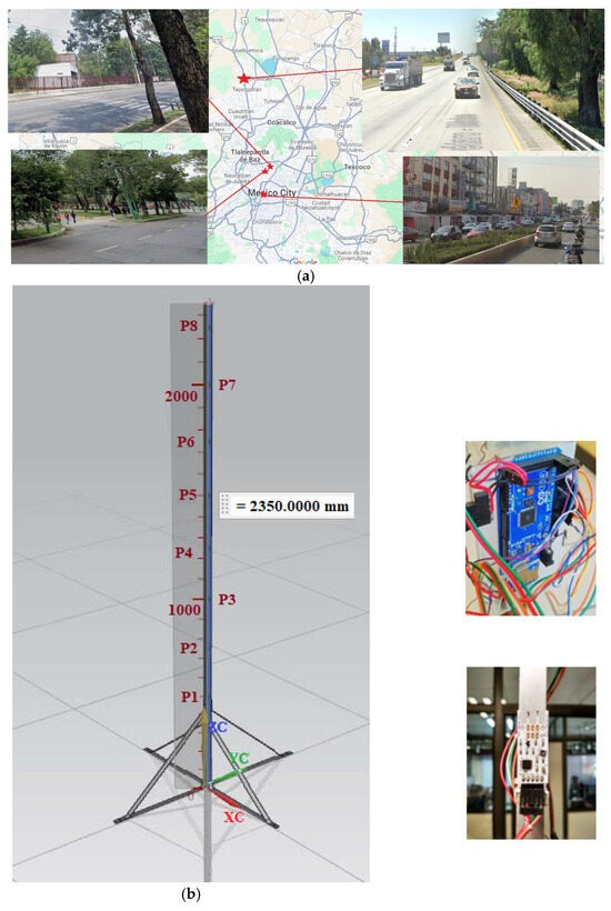 (a) Measuring device system at different locations and environmental conditions. Own image. Side photographs: Calle Miguel Bernard; central: Av. Ribera de San Cosme. (b) Data acquisition system.