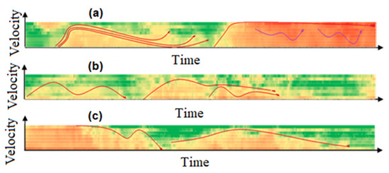 Based on the above considerations and the initial data, graphs like those presented in Figure 2 were generated. The red range represents higher velocities, while the green range represents lower velocities. The red lines in Figure 2a illustrate the chaotic and multidirectional nature of the flow, with purple lines indicating swirling conditions where higher velocities are observed. The subsequent red lines in Figure 2b suggest disturbances within turbulences. Finally, Figure 2c shows the end of a significant and nearly uniform disturbance and a smooth disturbance from start to finish. Measurements on Miguel Bernard Street yielded the results shown in Figure 2.