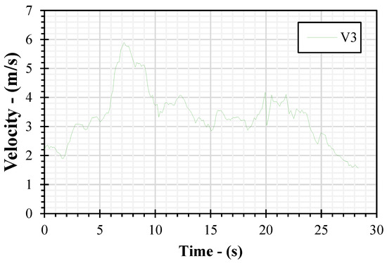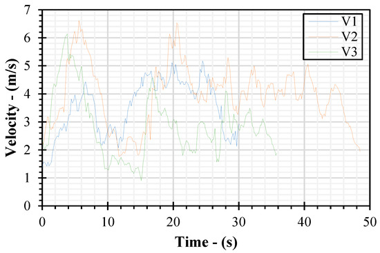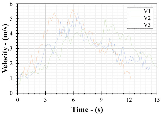 Figure 5 shows the flow curve patterns identified as “pulsating flows followed by a wake”, corresponding to vehicle velocities between 70 km/h and 90 km/h (the same for Figure 6). The highest-magnitude velocities are obtained from the disturbances generated by V2, although these can also be considered the most chaotic. It is evident that, in all cases related to this second type of disturbance, the disturbance lifespan increases considerably, as does the magnitude of the maximum velocity recorded for vehicles V2 and V3, ranging from 5.5 m/s to 6.5 m/s and from 5 m/s to 6 m/s, respectively, as mentioned in reference [26].