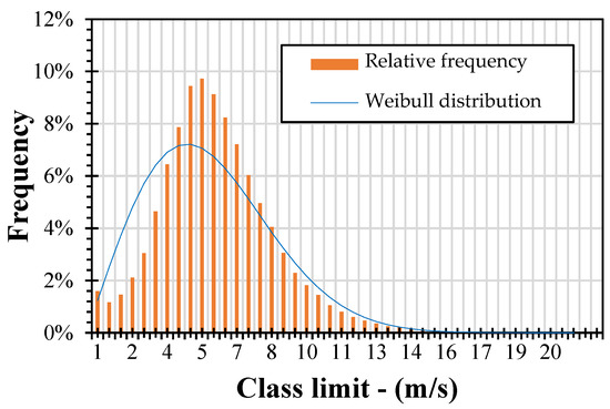 where λ is the scale factor, closely related to the average wind velocity, and k is the shape factor, which measures the distribution’s spread. These factors can be calculated using different methods [21]. One method involves the algebraic manipulation of the Weibull cumulative distribution function. The following equation describes the cumulative frequency of the sample, considering the shape and scale factors: