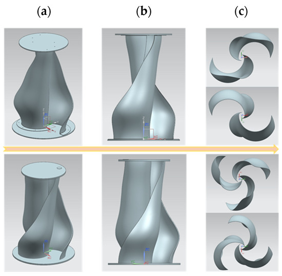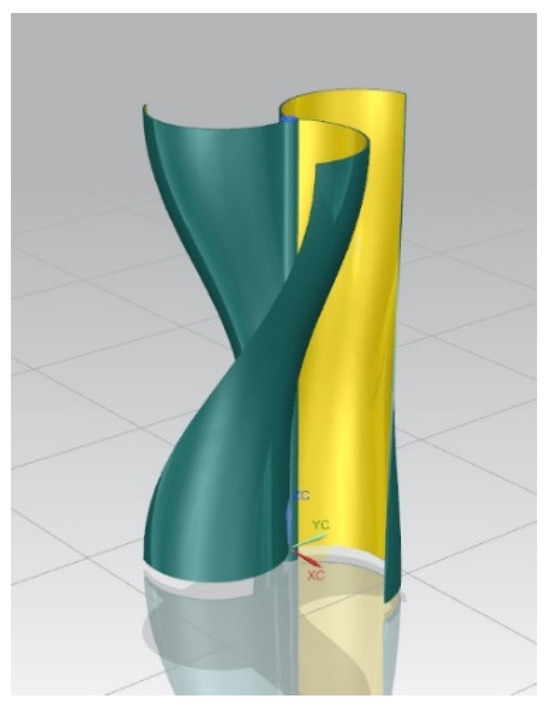 With the established dimensions, a CAD model of the rotor was created using SIEMENS NX software. Two models were developed: one with two blades, and another with three blades. In both cases, complementary twist angles are used (the aim is to ensure that wind always impacts a concave area of a blade; this assumption is achieved by restricting the twist angle so that the product of the angle and the number of blades results in at least 180°). The twist angle for the two-blade rotor is 90°, and for the three-blade rotor, it is 60°. Figure 12 illustrates the different designs; the top part shows the two-blade rotor and the bottom part shows the three-blade rotor [28,29,30,31].