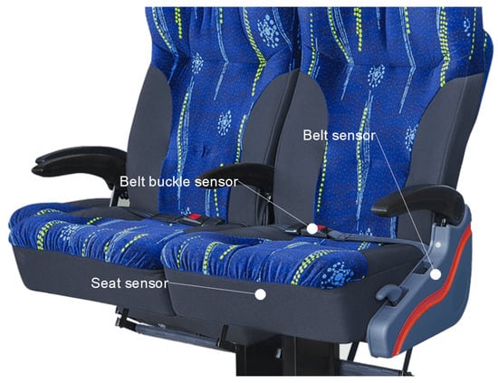 Before beginning monitoring, certain aspects are extracted from the literature, such as sensor placement, the sensing method, and seat belt usage detection. Figure 1 shows the estimated position of the sensors on a bus seat. The seat or occupancy sensor [] is located at the base of the seat.