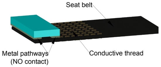The standard seat sensor consists of an arrangement of electrical resistors that help determine seat occupancy. Typically, this sensor’s resistance values range from 0 to 800 ohms without faults or interruptions. A specific range of resistive values determines if a person is present on the seat. The buckle sensor [] is already integrated into the seat belt and can be easily located. This sensor is magnetic and is found in all vehicles. Lastly, the seat belt sensor, designed specifically for this project, consists of a conductive thread seam located at the beginning of the seat belt reel (Figure 2). This conductive thread seam closes a normally open (NO) contact mounted on the reel’s structure (Figure 3). The mentioned seam is located at a distance “X” from the seat belt’s buckle, which closes the NO contact, indicating an attempt to bypass seat belt usage (Figure 4). If the seat belt is properly used, the seam will be at a distance greater than “X”, showing it is not being tampered with. On the other hand, if someone attempts to bypass the seat belt, the NO contact will close due to the conductive thread.