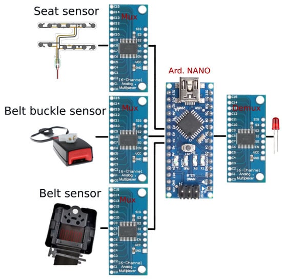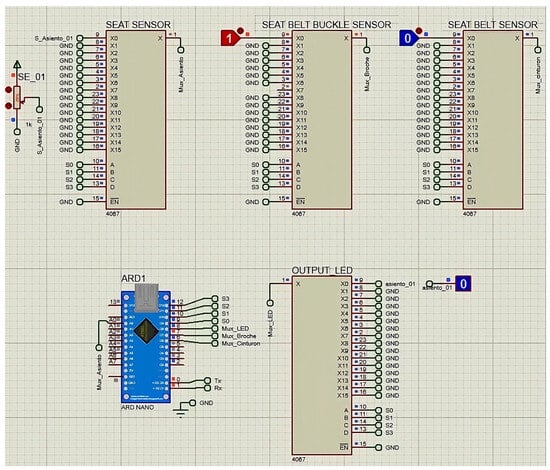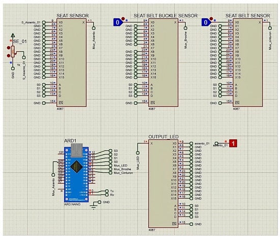 Figure 6 shows how the devices are interconnected. The signals sent by the sensors are divided by sensor type. Each multiplexer processes a specific sensor type, and these signals are captured by the Arduino Nano. The output uses a demultiplexer to send visual alerts to each seat. The Arduino Nano’s programming was performed using the open-source Arduino IDE software. The “Mux.h” library [] was used for managing the 74HC4067 multiplexer channels. The library creates a class called "Mux," which facilitates the declaration of inputs and outputs, as well as control over the pin selector for multiplexing or demultiplexing.