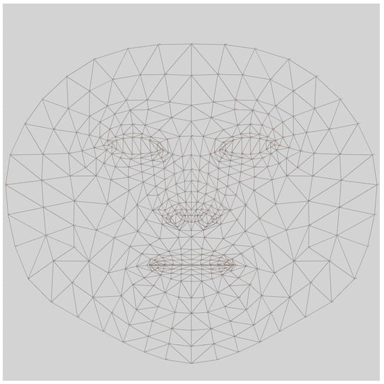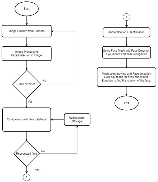 The flowchart in Figure 7 shows how the system detects the driver’s face. Images are captured via a USB 2.0 camera with AVI FHD@30fps video format []. The face is detected using MediaPipe’s FaceMesh, which identifies 486 Facial Landmarks for enhanced tracking shown in Figure 8. The system processes each frame to detect drowsiness indicators in the eyes, mouth, and head position.