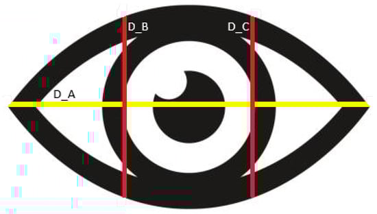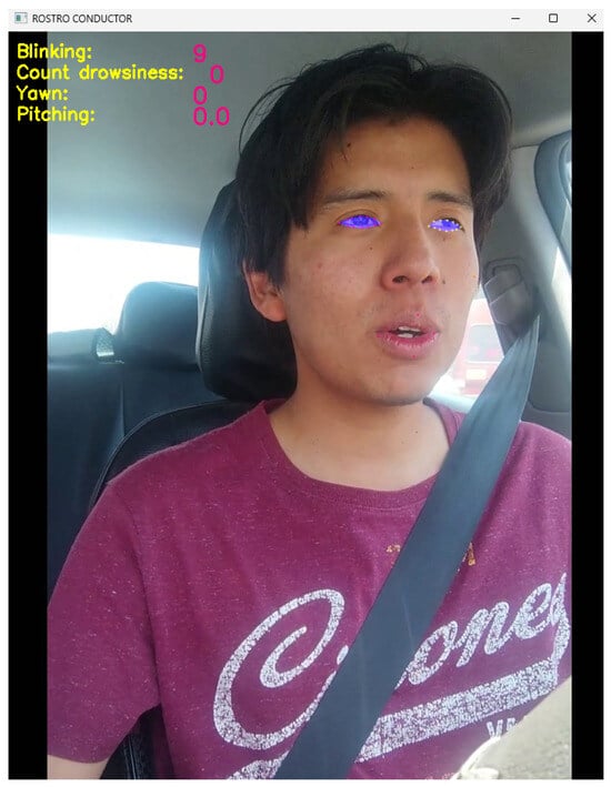 Figure 9 explains how to obtain the EAR between the values of height and width, taking as a reference the equation given in [] (Real-Time Eye Blink Detection using Facial Landmarks). Considering Equation (1), we have the distance A (DA), distance B (DB), and distance C (DC), and therefore, it can be concluded that if the eye is closed or close to being closed, the value that indicates us is close to zero, and it is true that there is variation depending on the user; hence, during the application of the neural network, the average is calculated to find the EAR (Eye Aspect Ratio) using the value of both eyes and thus achieve the detection of drowsiness. An alarm is activated at the moment of reaching 13 frames, and if the blink is long enough, a record is created with the duration, date, and time of the incident: