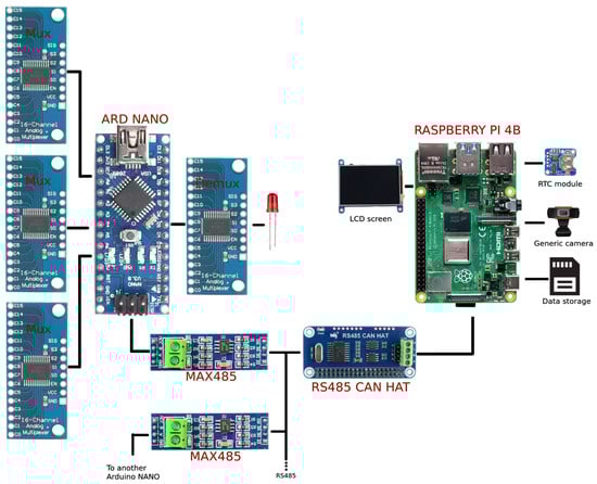 The system’s operation relies on the Raspberry Pi 4, which serves as the master and communicates with the Arduino Nano slaves via an RS-485 interface. This communication standard supports two- or three-wire connections with 22 or 24 AWG cables over a maximum distance of 1200 m [].