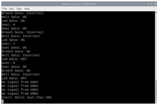 Figure 13 shows the interconnection between the Raspberry Pi 4 and Arduino Nanosystems. The RS-485 communication is half-duplex. The Arduino Nano uses the MAX485 module [], while the Raspberry Pi 4 uses the RS485 Can Hat module []. Data are sent every 5 min or when the update button is pressed. The LCD screen shows the status of the bus seats. Data from seat and driver monitoring are stored separately in text files.