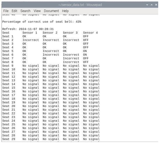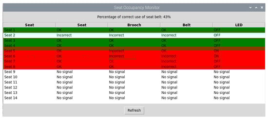 A visual interface was designed to display the status of bus seats, as shown in Figure 19. For testing purposes, only one Arduino Nano was used to send data to the main system, and only eight seats were monitored. The interface uses different colors for each row to represent seat status. Green indicates that the passenger is correctly using the seat belt, red indicates incorrect seat belt usage, and white (or uncolored) indicates that no passenger is detected in the seat. If no signal is received from the Arduino, the interface shows “No Signal”. Additionally, a percentage is displayed at the top of the window, indicating the percentage of seats with correctly used seat belts. If this percentage is less than 50%, an alert is triggered.