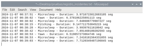 Figure 20 shows how information from the seat sensors is stored in a text file, including the time, date, and percentage of correctly used seat belts. A similar process is carried out for computer vision tests. A text file called the incident log is generated to record nodding, microsleeps, and yawns detected by the system, along with the date and time of each incident (Figure 21).