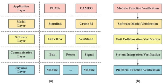 The functional perspective focuses on the overall functionality of the system and its verification processes, ensuring that the platform meets the requirements for complex simulation and calibration tasks. As shown in Figure 2b, this study implements a multi-level verification process, which ranges from basic functional testing to comprehensive performance evaluation. This process includes module function verification, software model verification, unit collaboration verification, system integration verification, and platform function verification. Through this verification process, the platform’s functionality and reliability in the field of power machinery virtual calibration are thoroughly ensured.