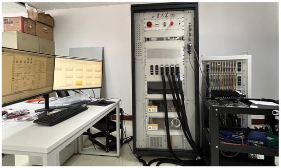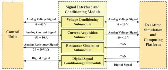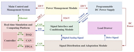 The functionalities of each module are as follows. The real-time simulation and computation platform is responsible for core system computation by running simulation models and achieving real-time data simulation and acquisition through various cards. The signal interface and conditioning module integrates operational amplifier circuits, current acquisition elements, and resistive components to achieve signal conversion and conditioning, meeting the system’s requirements for signal accuracy and compatibility. The main control and management system, with the software layer, performs system control, data processing, and analysis while offering operational support and automated testing capabilities. The power management module, managed via power distribution units (PDUs), provides a safe and stable power supply for other system modules. The programmable DC power source, controlled and monitored through signal transmission with the cards, delivers a 0–50 V DC output to meet the power demands of control units under complex conditions. The signal distribution and adaptive module flexibly enable external signal access and output, while the load drawer accommodates actual physical loads. This modular design not only optimizes the system structure but also significantly enhances its flexibility and reliability. Detailed descriptions of each module are presented in Table 1.