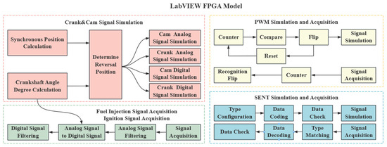 In the virtual calibration platform, LabVIEW handles the core task of high-frequency signal processing, primarily by building FPGA models. This enables the processing of complex signals with extremely high time resolution, providing foundational support for the simulation of power machinery systems. The programmability of FPGA endows the platform with high flexibility, allowing the modular design to achieve versatile signal generation and processing functions. It not only supports high-precision simulation of complex signals but also quickly adapts to various testing requirements, offering robust flexibility and scalability for the virtual calibration platform. Its main functions include simulating crankshaft and camshaft position signals, acquiring fuel injection and ignition drive signals, and processing high-frequency protocol signals such as Pulse-Width Modulation (PWM) and Single-Edge Nibble Transmission (SENT). These functions are implemented through parallel development and precise scheduling, ensuring simulation accuracy and stability for power machinery controllers under complex conditions. The FPGA model architecture of LabVIEW is shown in Figure 5.