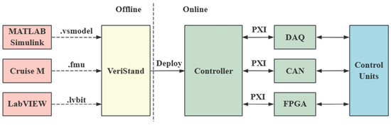 VeriStand is primarily responsible for managing hardware and software resources, real-time monitoring, and data visualization, providing a unified operational framework to support simulation tasks. Communication between VeriStand and the controller is established via Ethernet, while hardware interaction with DAQ, CAN, FPGA, and other cards is achieved through the PXI bus, ensuring the efficient and stable transmission of hardware signals. For software resource management, .lvbitx files generated by LabVIEW, .vsmodel files generated by Simulink, and .fmu files generated by AVL CRUISE M™ [23] are deployed into the controller via VeriStand, where they are subsequently transferred and loaded into the corresponding hardware modules. This process ensures that simulation models are seamlessly integrated with the physical hardware resources through VeriStand’s unified management framework. Additionally, VeriStand features a flexible graphical interface for real-time signal monitoring and data visualization, making system monitoring and diagnostics more intuitive. The signal communication architecture of VeriStand is given in Figure 6.