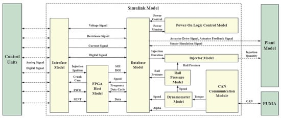 The signal interaction model is a key component of the model layer, responsible for signal processing and interactions among modules. To ensure accuracy and reliability, the signal flow process is divided into eight functional modules. First, the interface model maps interfaces to VeriStand, ensuring seamless signal interaction between the model layer and the software layer. The database model handles bidirectional conversion between electrical signals and physical signals, ensuring signal accuracy during simulations. The CAN communication model simulates CAN bus communication, enabling real-time data exchange and control between different hardware modules. The FPGA host model works in coordination with the LabVIEW FPGA model to compute and process complex signals, supporting real-time simulation of high-frequency signals. The power-on logic control model incorporates fail-safe mechanisms to monitor and control the power supply process, enhancing system safety and reliability. The dynamometer model simulates the load consumption of power and calculates rotational speed, providing realistic load characteristics for simulations. The injector model calculates injection quantity based on the collected injection duration, ensuring injection precision. The rail pressure model calculates and adjusts rail pressure in real time based on speed, ensuring fuel supply stability and efficiency. Through the collaboration of these modules, the signal interaction model establishes an effective bridge between the model layer and other layers, providing solid support for the efficient operation of the virtual calibration platform. The specific architecture is shown in Figure 7.