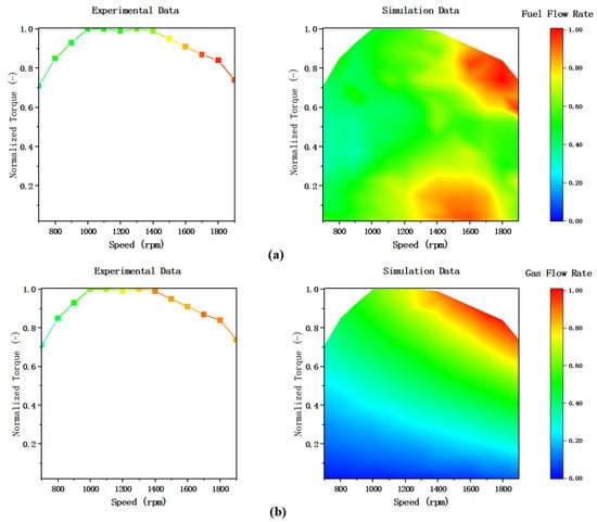 The results are presented in two formats: graphical plots and a table. Figure 9a illustrates the fuel flow rate distribution across different engine speed and torque combinations, while Figure 9b depicts the gas flow rate distribution. All data within each group were normalized to their respective maximum values. The experimental data (left) were limited to full-load operating points, whereas the simulation data (right) are displayed as two-dimensional contour maps, showing variations across a wide range of speed and torque combinations. To further quantify the consistency between simulation and experimental results, Table 3 lists the absolute errors of fuel and gas flow rates at full-load conditions for different engine speeds.