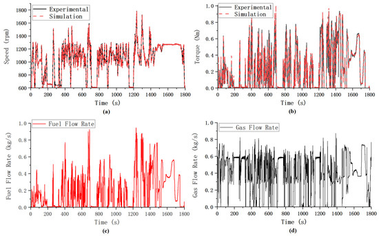 Transient testing results: (a) engine speed; (b) engine torque; (c) fuel flow rate; (d) gas flow rate.