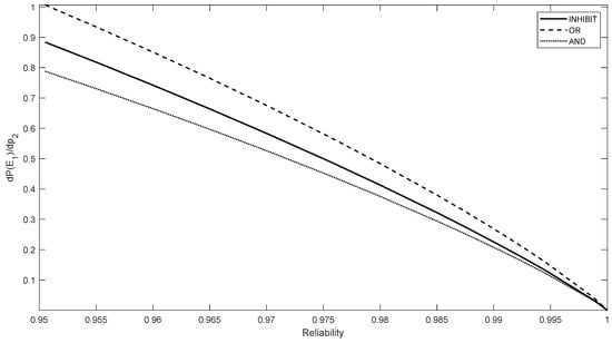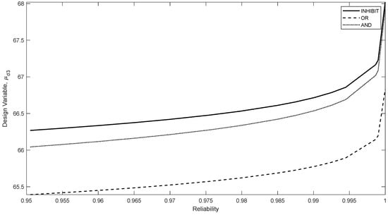 Figure 8 shows the trend of the design derivative of the system reliability of Gate 2, with respect to the second problem parameter, , which is the maximum allowable stress in constraint . The Gate 2 event models the state of the bolt-joint stress, while the value of is set to be 14 for all robust design problems. Since at all optimal solutions, the design derivatives of concern can be expressed as follows, based upon Equations (18), (23) and (29) for “and”, “or” and “inhibit” gates, respectively: