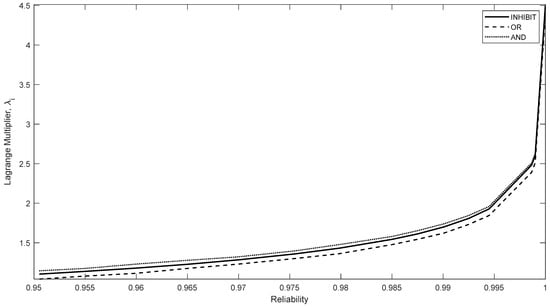 Figure 7 displays the relations between the Lagrange multiplier, , associated with the reliability of the stress constraint of the bolt joints. Based upon Equation (35), the value of is equal to the derivative of the optimal objective function, , with respect to parameter , which in this case is the targeted system reliability. Note that only one design variable among six, which is , is different among all results produced by different robust design formulations subject to different values of targeted system reliability. Consequently, the design derivative of , with respect to parameter , is equal to that of with respect to . This conclusion can be revealed by comparing the slopes of the curves presented in Figure 6 with the corresponding ones in Figure 7. Specifically, the slope of the “and” gate curve in Figure 6 is slightly larger than that of the “inhibit” gate for reliability less than 99%. As a result, the curve of the value of the “and” gate is notably higher than that of the “inhibit” gate in Figure 7.