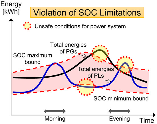 For the safety concerns of a power system, each storage system should keep its SOC maximum and minimum limitations. This means that SOC limitations must bound energy generation and consumption. Two safety constraints are given; the first constraint prevents energy generation and consumption from exceeding or violating the SOC maximum limitation to avoid overcharging ESS, the second safety constraint prevents energy generation and consumption from violating SOC minimum limitations. Both safety conditions preserve the SOC maximum and SOC minimum limitation of ESS. To guarantee the safe operation, the two safety constraints must be satisfied.