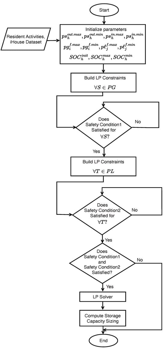 Algorithm 1 outlines the process of constructing a linear programming model to compute the optimal storage capacity sizing. The LP solver determines the optimal capacity sizing when the safety conditions are met for all the arrangements of power devices and the connections between them.