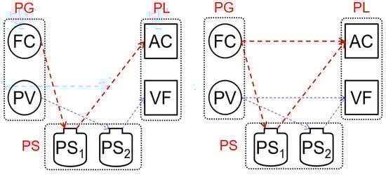 - Case 2: This connection arrangement between power devices introduces parallel connections, simulating a more realistic power system where generation simultaneously supports direct connection to power loads and ESS. It emphasizes the role of user activity schedules in identifying energy allocation priorities and allows for the evaluation of how ESSs handle charging and discharging simultaneously. This setup is applicable for smart homes with renewable energy sources (RESs) and dynamic user behavior. It is helpful for energy-sharing strategies between real-time power usage and energy saving for later use.